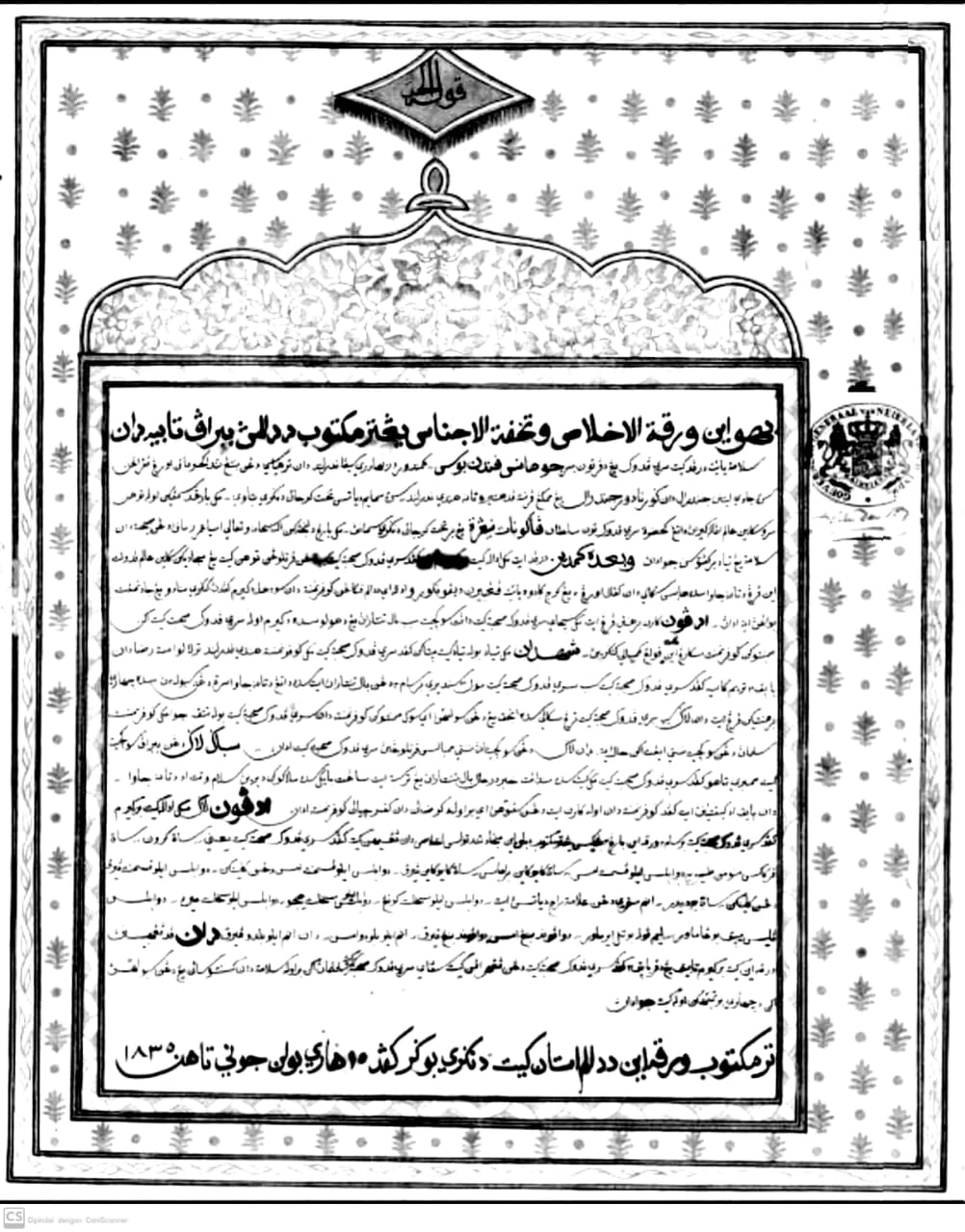 manuskrip tentang jenis-jenis kain yang masuk dan digunakan di lingkungan keraton songennep pada masa pemerintahan sultan abdurrahman. Naskah ini menjadi bukti historis keterkaitan antara budaya tekstil, kekuasaan, dan dinamika estetika di lingkungan keraton. (tadjul arifien r. /doc. Dimadura. Id)
